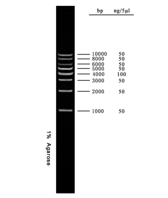 是由 8 條線狀雙鏈 DNA 條帶組成:10000、8000、6000、5000、4000、3000、2000、1000